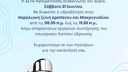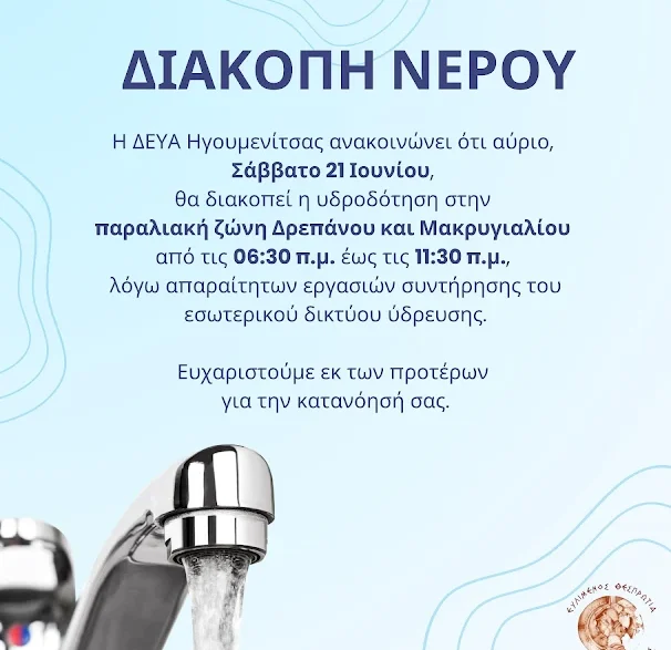 Η ΔΕΥΑ Ηγουμενίτσας ανακοινώνει ότι αύριο, Σάββατο 21 Ιουνίου, θα διακοπεί η υδροδότηση στην παραλιακή ζώνη Δρεπάνου και Μακρυγιαλίου από τις 06:30 π.μ. έως τις 11:30 π.μ., λόγω απαραίτητων εργασιών συντήρησης του εσωτερικού δικτύου ύδρευσης.