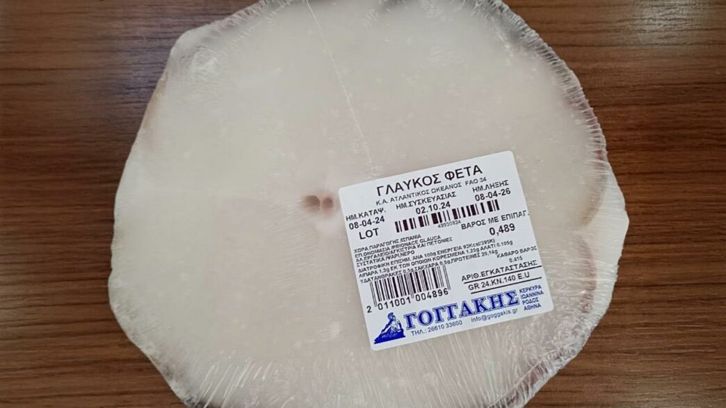 Ο ΕΦΕΤ και συγκεκριμένα η Περιφερειακή Διεύθυνση Ηπείρου, κατά τη διενέργεια ελέγχων, προέβη σε δειγματοληψία ΓΛΑΥΚΟΣ ΦΕΤΑ ΚΑΤΕΨΥΓΜΕΝΟΣ, Κ.Α. Ατλαντικός Ωκεανός FAO 34, χώρα παραγωγής Ισπανίας, με ημερομηνία κατάψυξης 08-04-24, ημερομηνία συσκευασίας 02-10-24, ημερομηνία ανάλωσης 08-04-26 και αριθμό παρτίδας LOT 49930924 που παράγεται από την επιχείρηση ΓΟΓΓΑΚΗΣ Α.Ε.Β.Ε.