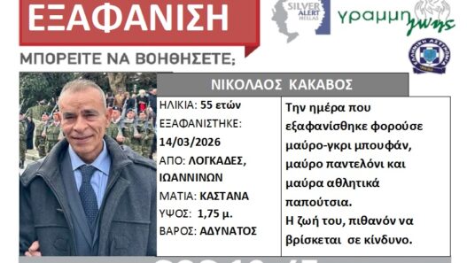 Σύμφωνα με το thesprotiatoday.gr, ο Νικόλαος Κάκαβος, 55 ετών, αγνοείται από τις 14 Μαρτίου 2026, όταν εξαφανίστηκε από το σπίτι του στους Λογκάδες Ιωαννίνων. Οι οικείοι του ενημέρωσαν τη Γραμμή Ζωής στις 22 Μαρτίου, η οποία ενεργοποίησε αμέσως το Silver Alert λόγω ανησυχιών για την ασφάλειά του. Ο αγνοούμενος περιγράφεται ως άτομο με γκρι κοντά μαλλιά, καστανά μάτια, ύψος 1,75 μέτρα και αδύνατη σωματική διάπλαση. Κατά την ημέρα της εξαφάνισής του φορούσε μαυρογκρί μπουφάν, μαύρο παντελόνι και μαύρα αθλητικά παπούτσια.