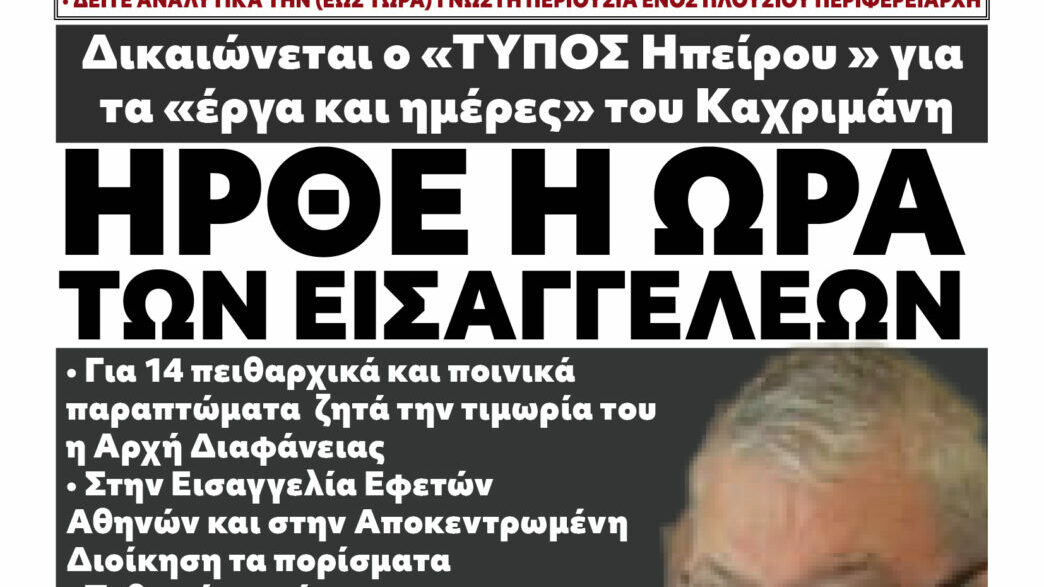 Το τραγικό με τον κ.Καχριμάνη είναι πως ενώ είχε γίνει γνωστό ότι υπάρχουν πορίσματα, διαβεβαίωνε το Περιφερειακό Συμβούλιο και τα στελέχη της παράταξής του ότι δεν υπάρχει κανένα θέμα, ούτε και συντρέχει λόγος ανησυχίας!!! Να όμως που είχαν δίκιο να ανησυχούν τα στελέχη του, αφού από την Αρχή Διαφάνειας επιρρίπτονται ευθύνες σε συνεργάτες του αιρετούς και σε υπάλληλο του Περιφερειακού Ταμείου Ανάπτυξης. Όμως όλα τα παραμύθια έχουν ένα τέλος, αλλά για τον κ.Καχριμάνη όσα θα αντιμετωπίζει πλέον θα μοιάζουν με εφιάλτη, με θρίλερ, με άγνωστο φινάλε, με εκτιμήσεις όμως πως αν όλα λειτουργήσουν σωστά, τότε σίγουρα όχι αίσιο και ευτυχές.