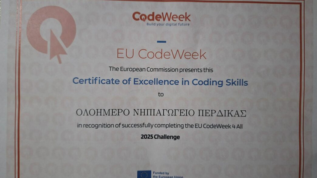 Περηφάνια και χαρά στην εκπαιδευτική κοινότητα της Πέρδικας, καθώς το τοπικό Νηπιαγωγείο κατάφερε να αποσπάσει για δεύτερη συνεχόμενη χρονιά διάκριση στην EU Code Week, την πανευρωπαϊκή πρωτοβουλία που προωθεί τη δημιουργικότητα, τη συνεργασία και την υπολογιστική σκέψη μέσα από δραστηριότητες προγραμματισμού για όλες τις ηλικίες. Το σχολείο τιμήθηκε με το Certificate of Excellence in Coding Skills από το πρόγραμμα EU Code Week 4all, αποδεικνύοντας ότι η καινοτομία στην εκπαίδευση δεν έχει ηλικιακά όρια.