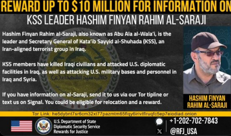 Το πρόγραμμα «Rewards for Justice» του αμερικανικού υπουργείου Εξωτερικών ανέφερε ότι ο Hashim Finyan Rahim al-Saraji φέρεται ως ο ηγέτης της οργάνωσης Kata’ib Sayyid al-Shuhada (KSS), την οποία χαρακτηρίζει «τρομοκρατική ομάδα».