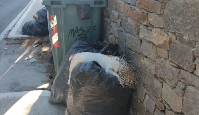 Αποτροπιασμό προκαλεί η εικόνα νεκρού σκύλου, τον οποίον ασυνείδητοι πέταξαν δίπλα σε κάδους απορριμμάτων, σε κεντρικό σημείο της Σύρου.