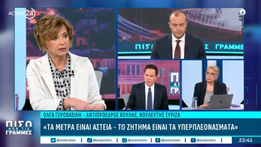 Συνέντευξη της Όλγας Γεροβασίλη, Ε’ Αντιπροέδρου της ΒτΕ και βουλευτή Άρτας του ΣΥΡΙΖΑ – Προοδευτική Συμμαχία, στην τηλεόραση του Action24 στην εκπομπή «ΠΙΣΩ ΑΠΟ ΤΙΣ ΓΡΑΜΜΕΣ», στους δημοσιογράφους Γ. Πιέρρο, Ε.Καλογεροπούλου & Δ. Τάκη