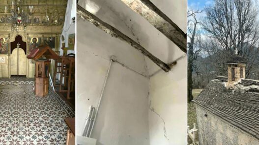 Ο πρόσφατος ισχυρός σεισμός των 5,3 βαθμών στην περιοχή της Θεσπρωτίας δεν άφησε ανέγγιχτη την ιστορική Μονή Γενεθλίων Θεοτόκου Μίχλας στις Πέντε Εκκλησίες Παραμυθιάς, προκαλώντας ανησυχητικές φθορές στο οικοδόμημα. Όπως σημειώνει το thesprotiatoday.gr, ο τρούλος του καθολικού φέρει πλέον ρωγμές, ενώ ζημιές εντοπίζονται και στη σκεπή, συνοδευόμενες από εσωτερικά σχισίματα στην τοιχοποιία.